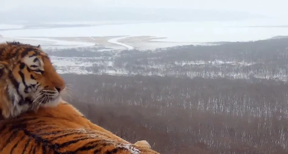 «Первое видео с амурским тигром на фоне столицы Приморья удалось получить ученым дирекции заповедников «Земля леопарда». Фотоловушка наглядно показала, что редкие кошки — соседи горожан. Сначала на кадрах виден солнечный день, так что можно увидеть очертания города и знаменитые владивостокские мосты. Вскоре погода изменилась, пошел снег, и это место посетил взрослый амурский тигр», — рассказал сотрудник национального парка Земля леопарда