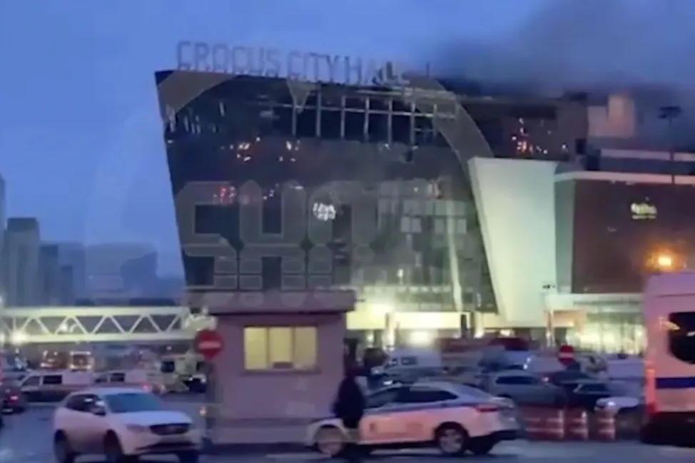 Сотрудники МЧС продолжают пролив конструкций концертного зала "Крокус сити холл" в Красногорске, из здания продолжает валит чёрный едкий дым.