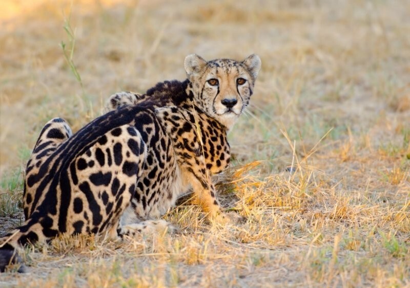 Королевский гепард - это довольно редкая мутация обычного гепарда, впервые обнаруженная в Южной Африке около 100 лет назад. Шерсть это зверя покрыта чёрными полосами вдоль спины и крупными сливающимися пятнами по бокам.