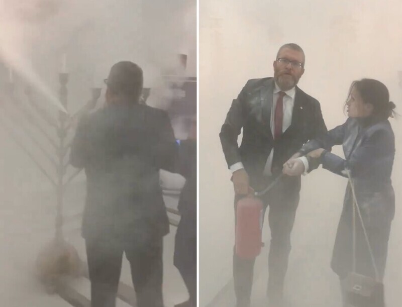 В видеоролике, распространяемом в польских СМИ и соцсетях видно, как депутат хватает порошковый огнетушитель и гасит менору – семисвечник, который считается одним из символов иудаизма и зажигается на еврейский праздник Ханука.