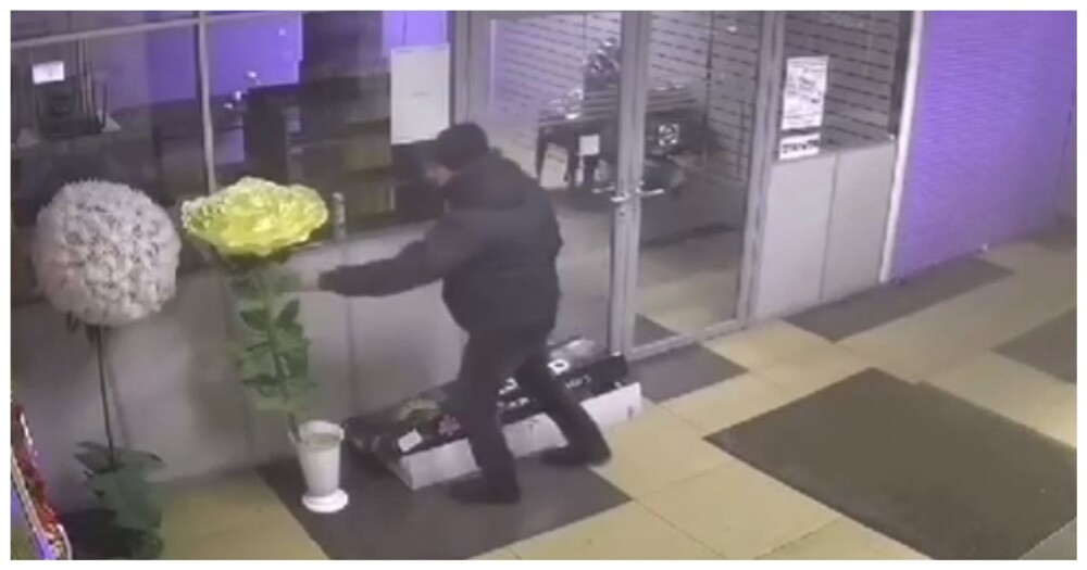В Москве мужчина украл большой декоративный цветок, стоявший у входа в цветочный магазин. Момент похищения цветка на видео.