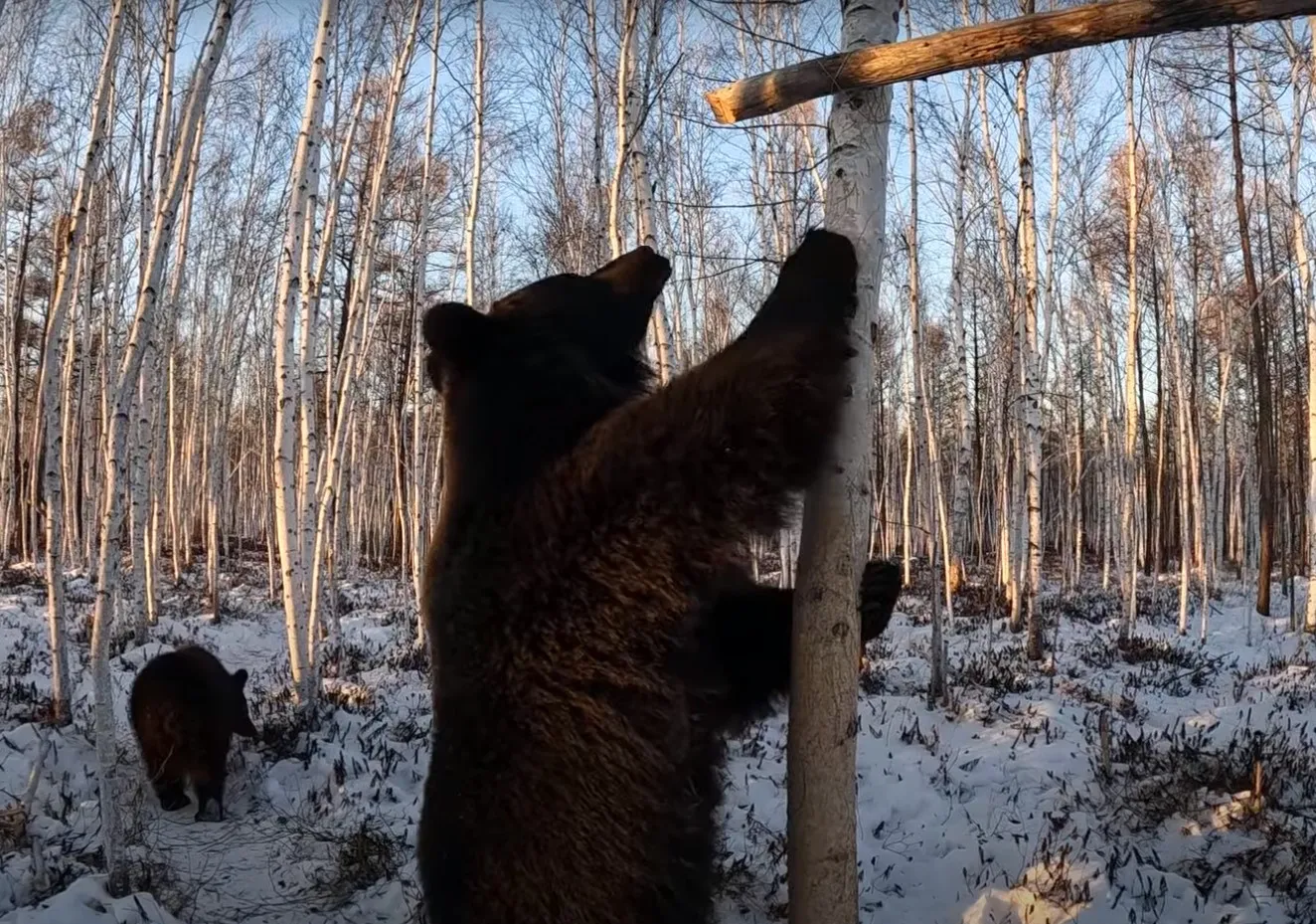 Владелец хабаровской экофермы "Мишкина берлога" Михаил Филиппов показал вечерние будни медведицы Маши и её детишек Дуси и Буржуя. Мужчина вывел зверей на прогулку, устроив им соревнования по добыче сгущёнки.