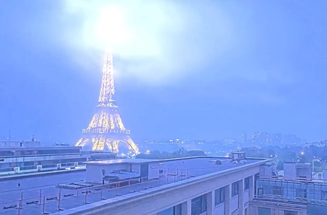 Камера видеонаблюдения засняла, как молния ударила в Эйфелеву башню в Париже. На видео — яркая вспышка, на мгновение освещающая центр французской столицы.